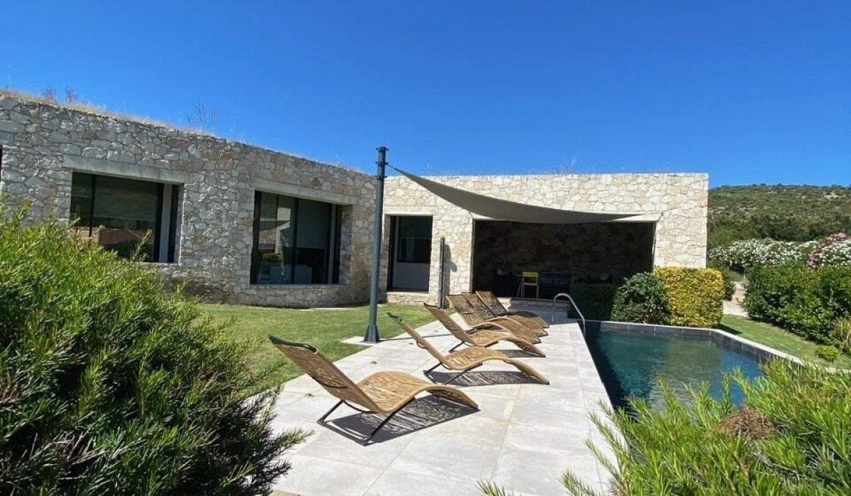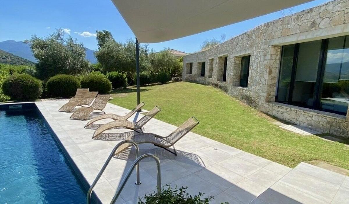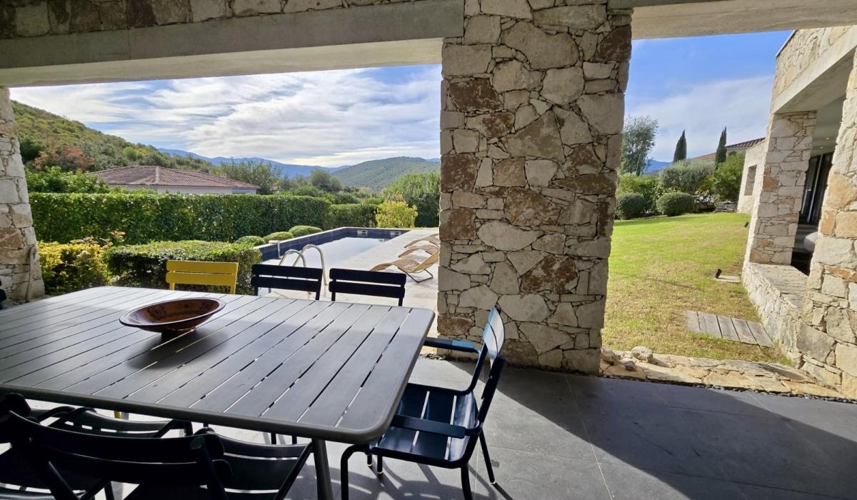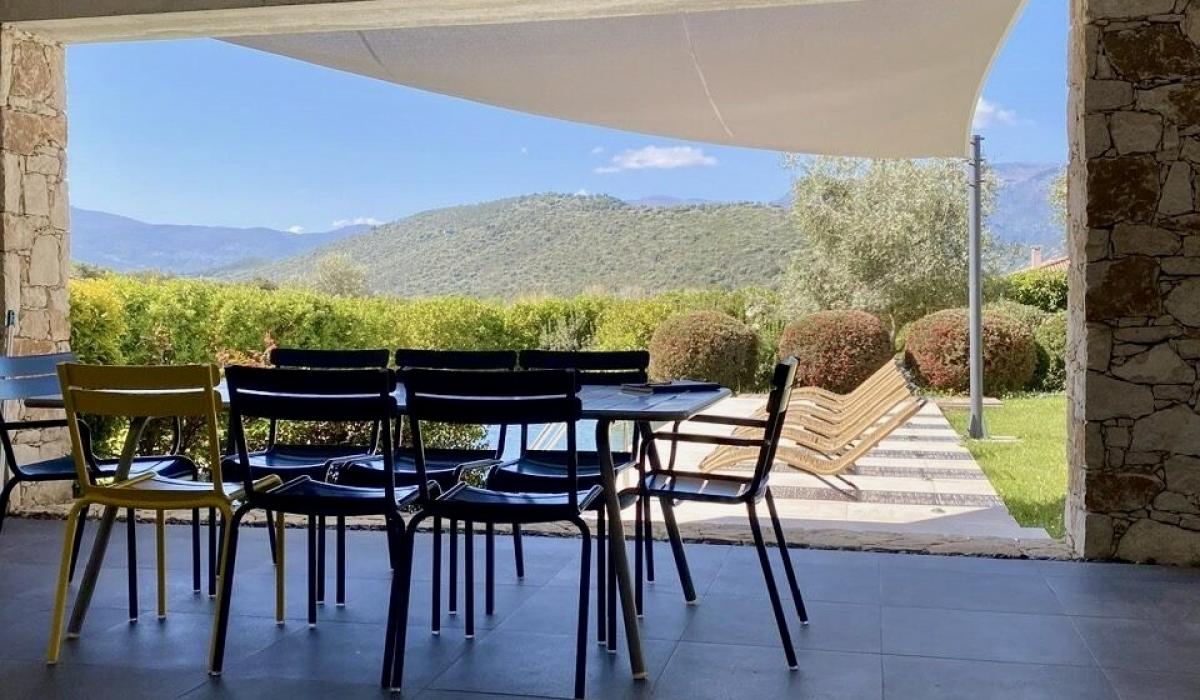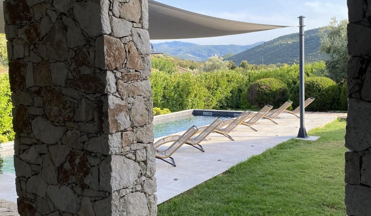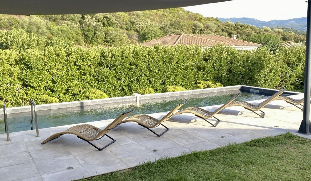 Profitez d’un jardin arboré, d’une piscine privative équipée de transats, et d’un terrain de pétanque pour des moments de détente sous le soleil corse.
